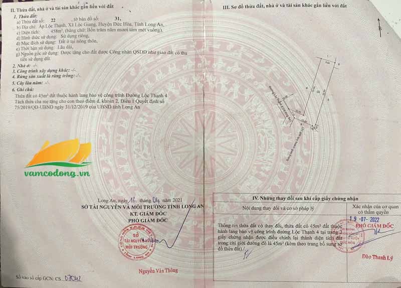 Mô tả: Nền ngang 9m dài 43m, tổng diện tích công nhận 458m2. Đất mặt tiền đường Lộc Thạnh 4 (đan 5m), có lối vào hơn 4m. Trên đất có nhà 4x22 01 trệt 01 lầu và 16 phòng trọ 4x4.