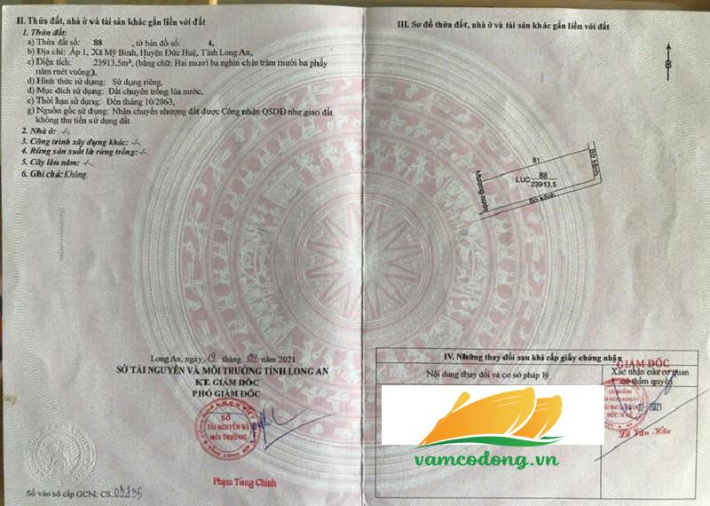Mô tả: Đất lúa, ngang 294m dài 81m, tổng diện tích công nhận 23913m2. Đất có 2 mặt tiền kênh.