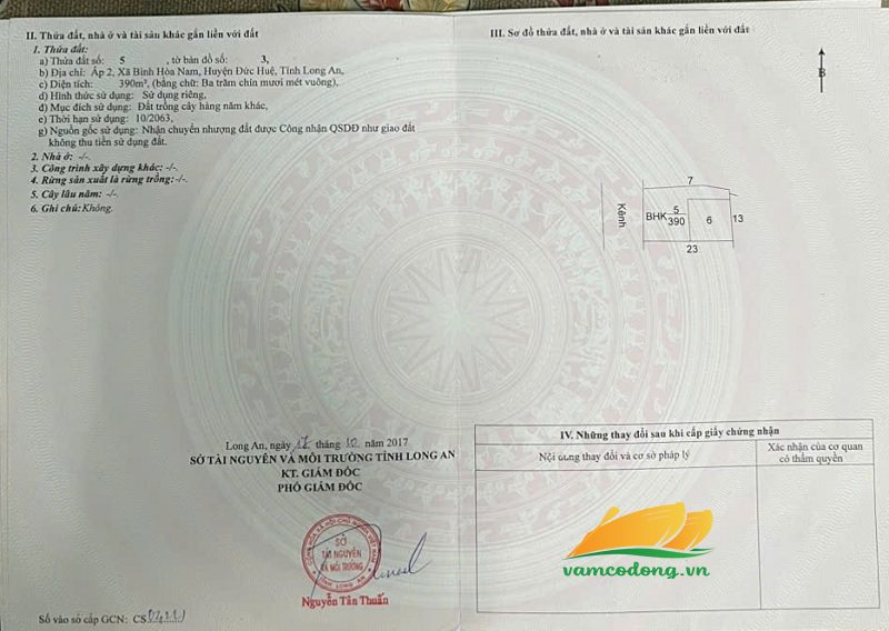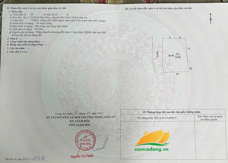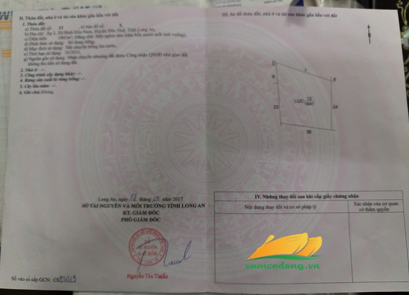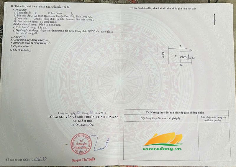 Mô tả: Đất thổ cư, đất vườn và đất lúa, MT sông Vàm Cỏ Đông 77m, mặt tiền kênh 67m, trong đó bao gồm 235m2 thổ cư, 1988m2 đất vườn và 6535m2 đất lúa, tổng diện tích công nhận 8758m2.