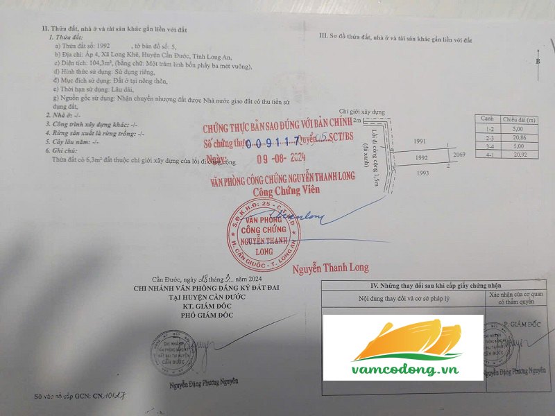 Mô tả: Đất thổ cư ngang 5m, dài 20m, tổng diện tích công nhận 104m2.