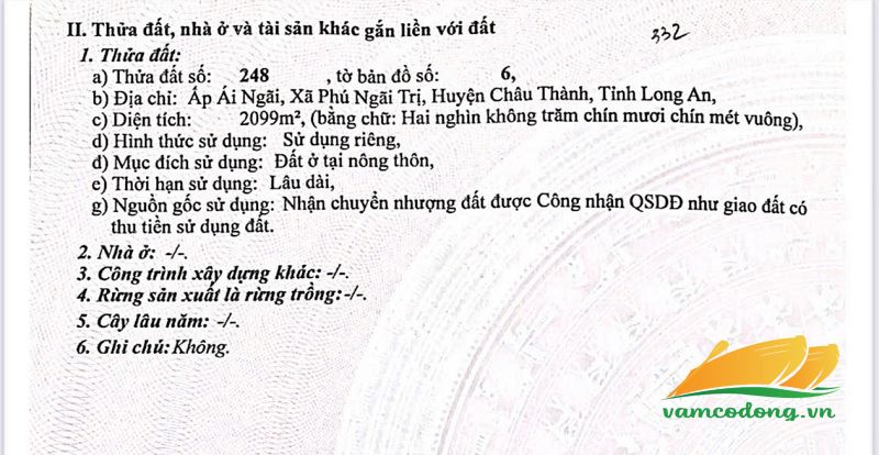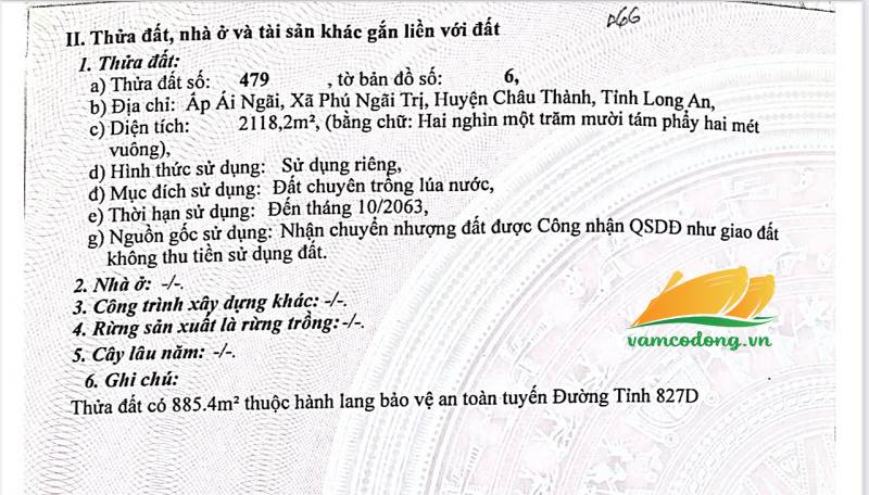 Mô tả: Đất thổ cư và đất lúa, ngang 67m, dài 65m, hậu 48m, tổng diện tích công nhận 4207m2.