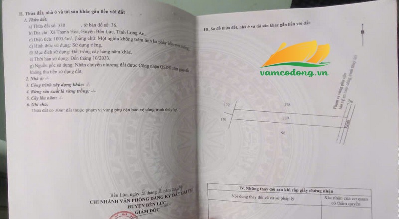 Mô tả: Đất vườn, ngang 10m, dài 102m, tổng diện tích công nhận 1003m2.