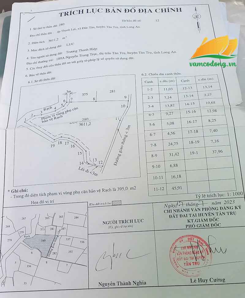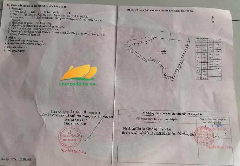 Mô tả: Đất lúa, ngang 69m, dài 56m, tổng diện tích công nhận 3611m2. Đất không được vuông.