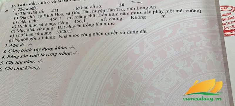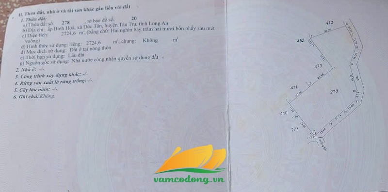Mô tả: Đất thổ cư, đất vườn và đất lúa, ngang 42m, dài 45m, nở hậu phía sau, tổng diện tích 4667m2 trong đó bao gồm 2724m2 thổ cư, 710m2 đất vườn và 1233m2 đất lúa.