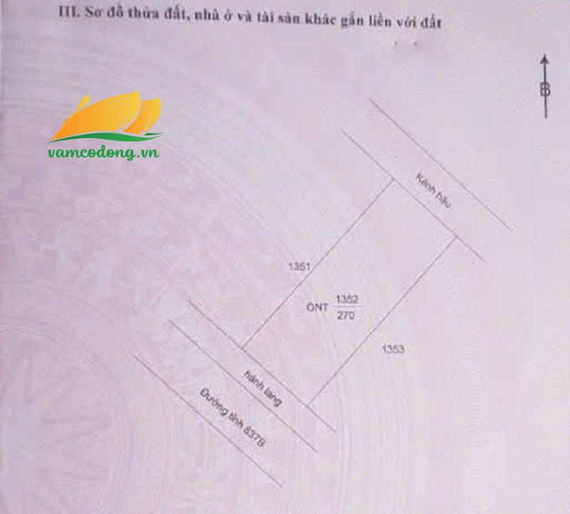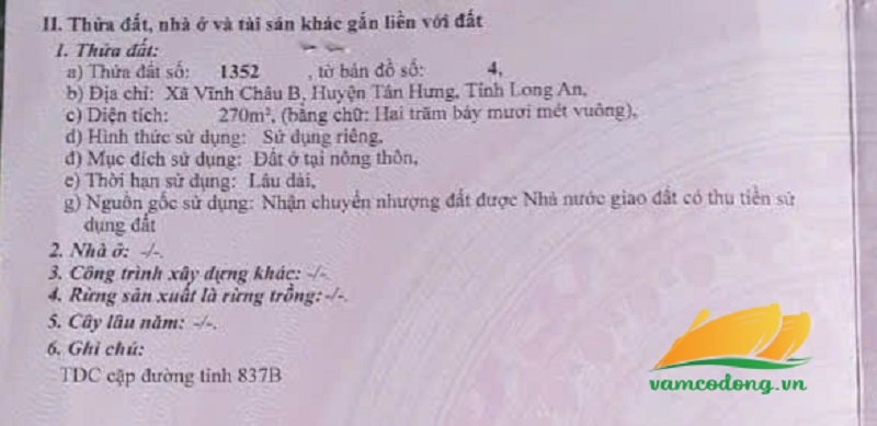 Mô tả: Đất thổ cư, ngang 10m, dài 27m, tổng diện tích công nhận 270m2.
