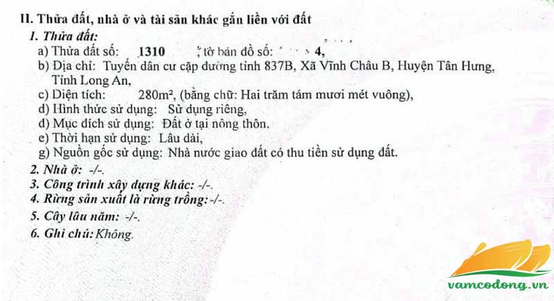 Mô tả: Đất thổ cư, ngang 10m, dài 28m, tổng diện tích công nhận 280m2.