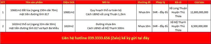 (1) Long Thuận – Thủ Thừa: 10681m2 đất lúa (150x70) MT đường tỉnh 817 Giá 12,8 tỷ đồng