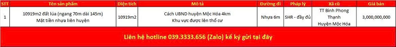 (1) Mộc Hóa – Bình Phong Thạnh: 10919m2 đất lúa (70x145) MT nhựa liên huyện Giá 3 tỷ đồng