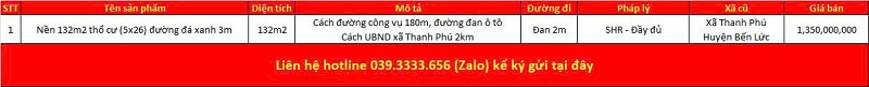 (1) Thanh Phú – Bến Lức: Nền thổ 5x26 đường ô tô cách Công Vụ 180m Giá 1,35 tỷ đồng