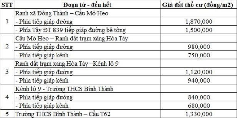 Bảng giá đất thổ cư đường tỉnh 839 thuộc địa phận xã Bình Thành
