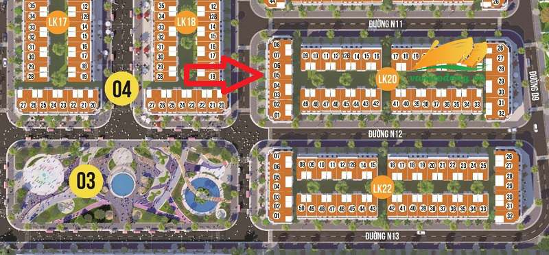 (6) Nền LK23-19 diện tích 97m2 (ngang 5m dài 19.5m) đường N13, gần Quảng trường nhạc nước, cách cổng dự án 400m.
