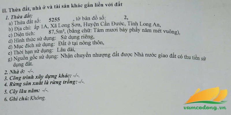 Mô tả: Đất thổ cư, ngang 4.5m, dài 19m, tổng diện tích công nhận 87.5m2.