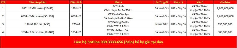 (3) Thủ Thừa – Tân Thành: 176m2 (ngang 5m dài 35m) thổ cư MT Đường nhựa Bo Bo Giá 990 triệu