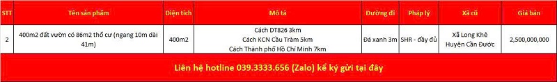(1) Cần Đước – Long Khê: 400m2 đất vườn có 86m2 thổ cư đường đá xanh 3m Giá 2,5 tỷ đồng