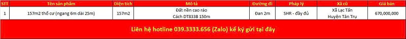 (1) Tân Trụ – Lạc Tấn: 157m2 thổ cư đường 2m cách DT833 150m Giá 670 triệu