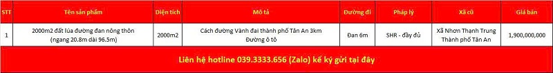 (1) Tân An – Tây Ninh (Long An – Tân An): 2000m2 đất lúa đường đan nông thôn Giá 1,9 tỷ đồng