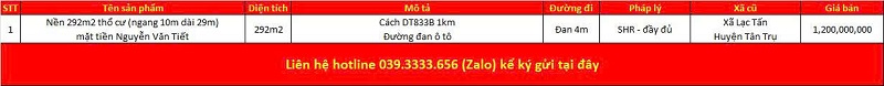 (1) Tân Trụ – Lạc Tấn: 292m2 (10x29) thổ cư MT Nguyễn Văn Tiết Giá 1,2 tỷ đồng